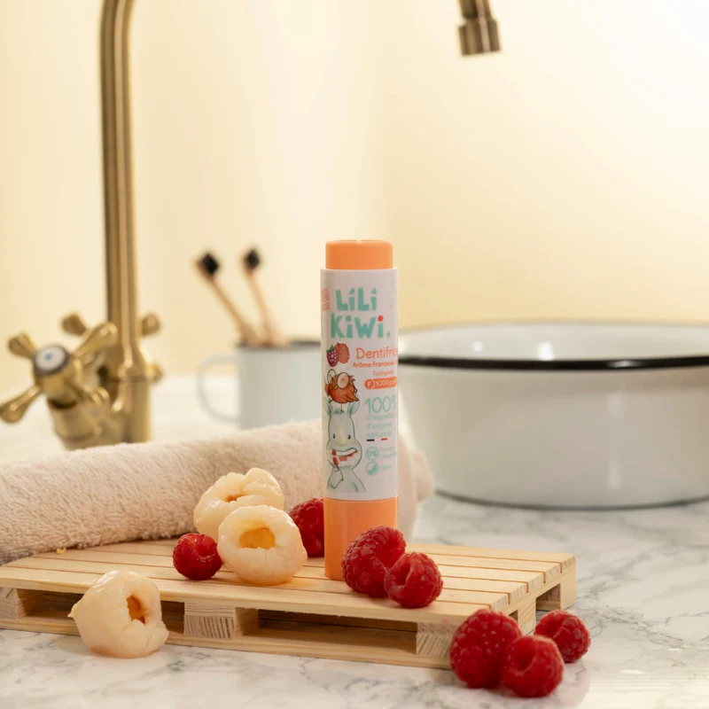 100% prirodna organska dječja pasta za zube s preporučenom dozom floura (1000 ppm) za prevenciju nastanka karijesa. Formula bez konzervansa, bojila, dodatka mentola i alergena, sigurna i za djecu s dijabetesom. Namijenjena djeci od navršene 3. godine života na dalje. Voćni okus maline i litchija. Vrlo niska abrazivnost (RDA = 10) za zaštitu potpuno novih, osjetljivih zubića. Neutralan pH kako bi se izbjegla demineralizacija mladih zubi. Zahvaljujući formatu nalik na olovku, svaki pritisak tubice oslobađa preciznu količinu paste potrebnu za četkanje.